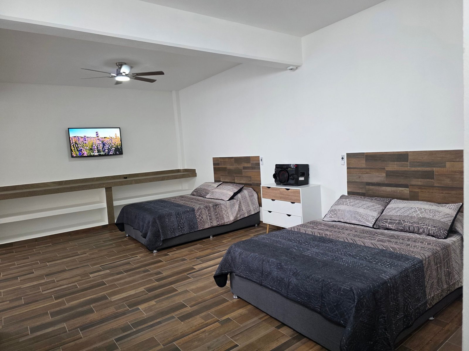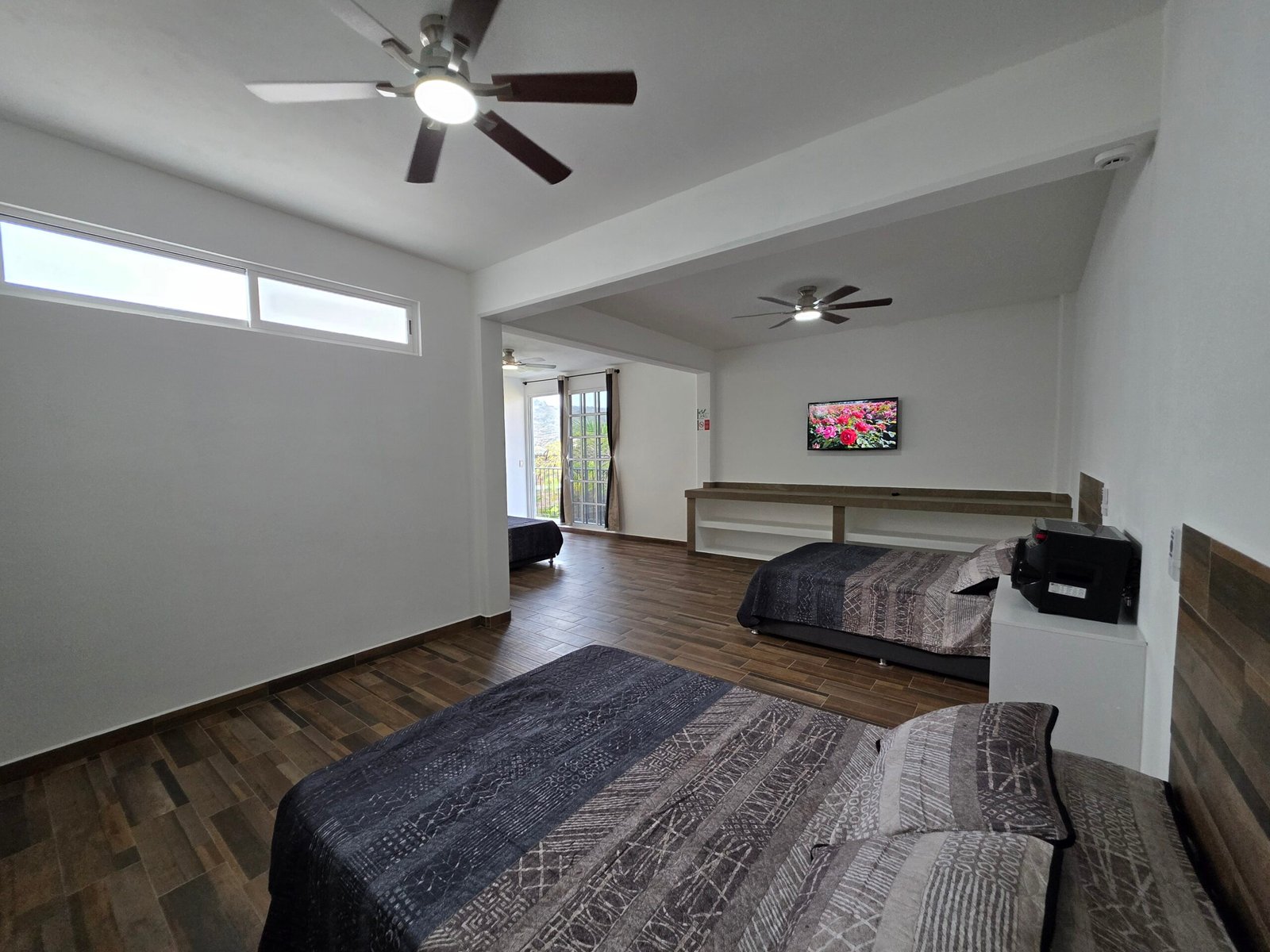 Una hermosa habitación con 3 camas dobles, ventilador en cada cama instalado en el techo, amplio baño completo y privado, además de tv con internet. La habitación cuenta con andador con vista al amplio jardín con piscina exterior y wifi gratuito.